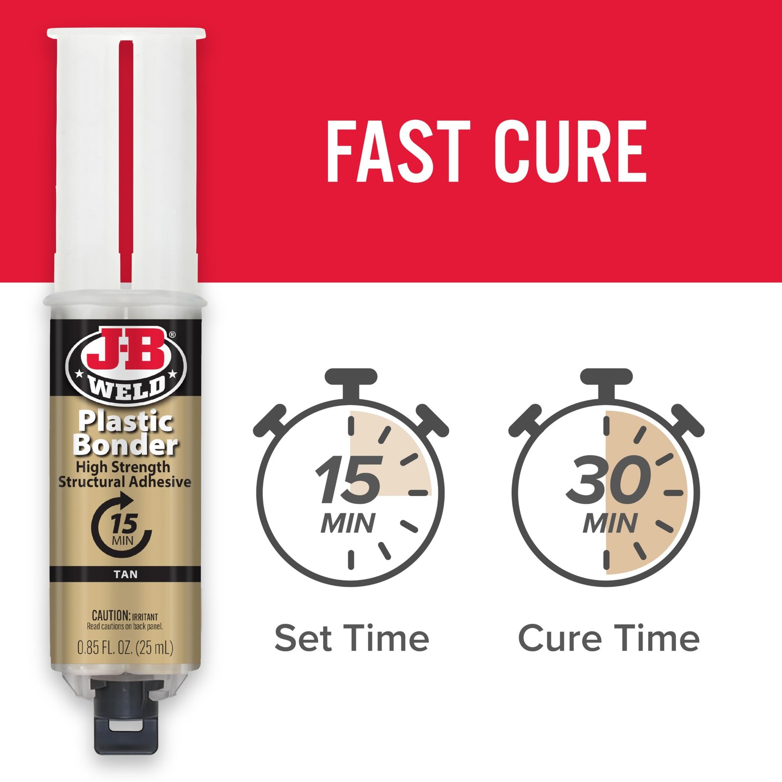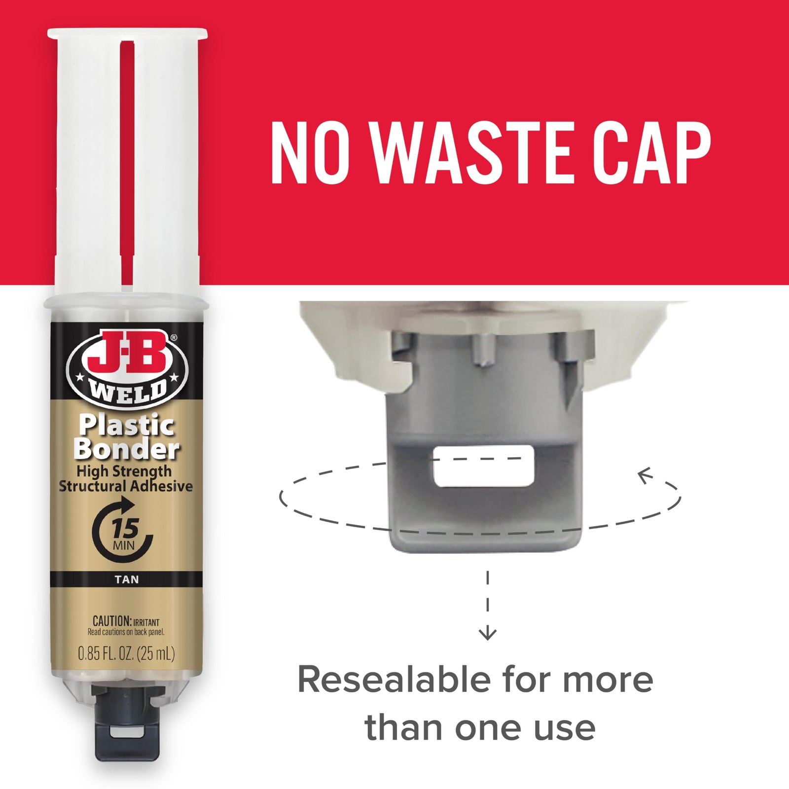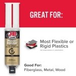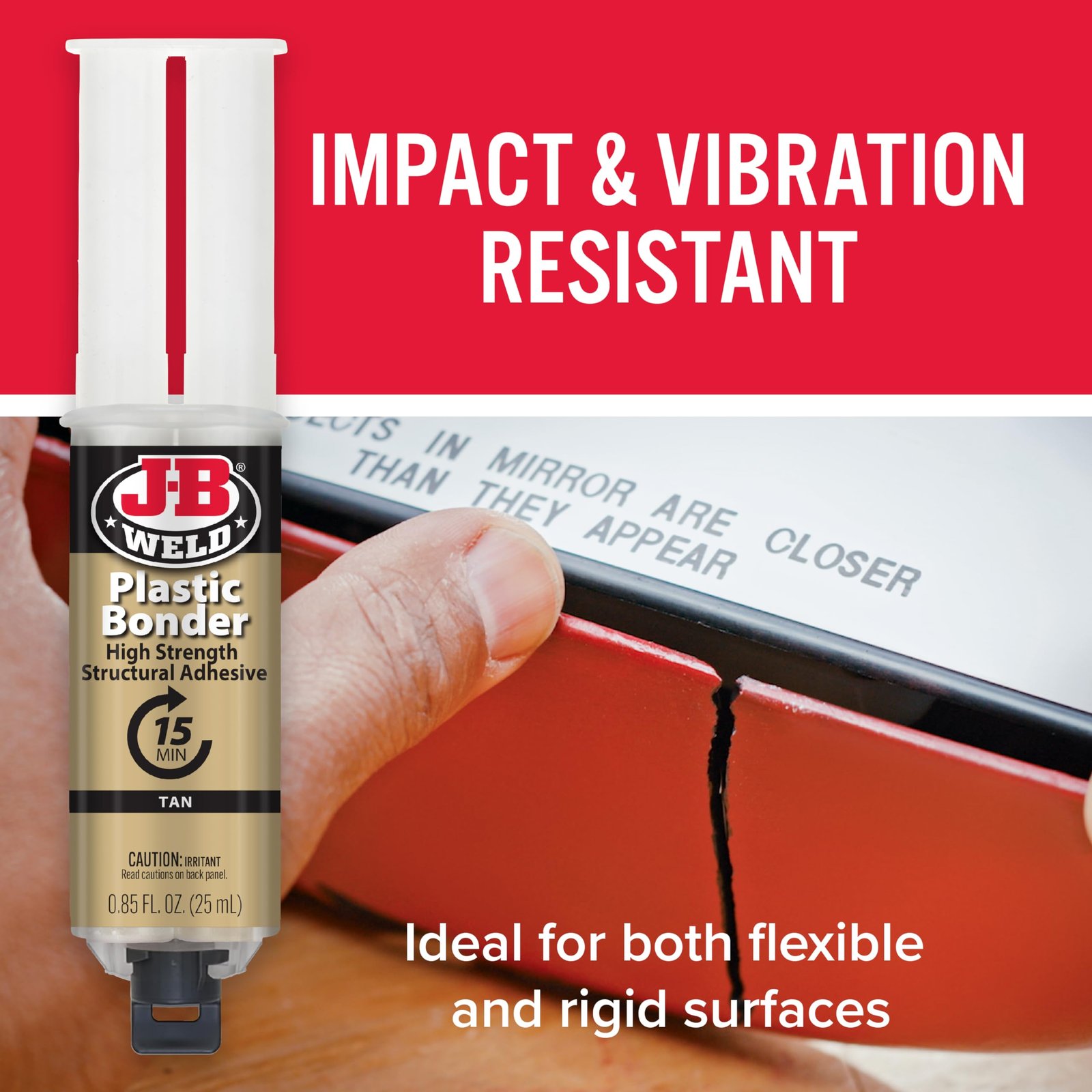 - J-B WELD PLASTICBONDER (Tan): A quick setting and multipurpose two part urethane adhesive & gap filling system that provides a strong and lasting bond to many plastic surfaces. J-B Weld PlasticBonder is great for DIY plastic repairs, filling dents, bumper repairs and more! J-B Weld PlasticBonder now comes in a syringe allowing for an easy 1:1 mix ratio. The unique syringe has a re-sealable cap that prevents drying out and leaking, allowing for multiple uses!